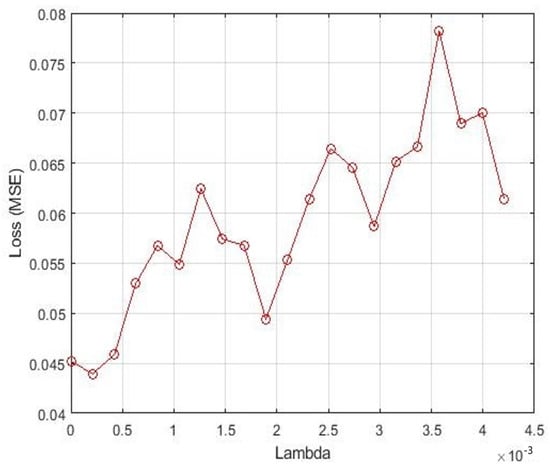 For the optimization of regularization parameters, the values adopted in this paper are 20 points [] at equal intervals from 0 to 20/n (50-fold cross-validation, 4/5 sample data as training set). The step size for the values are shown in Table 3. Figure 9 shows the average loss rate corresponding to the 20 values. When the values gradually increase, the average loss rate shows an upward trend, proving that the regularization parameter calculation based on learning is effective. When , the average loss rate is the smallest, which is best applied to the subsequent RNCA model training.
