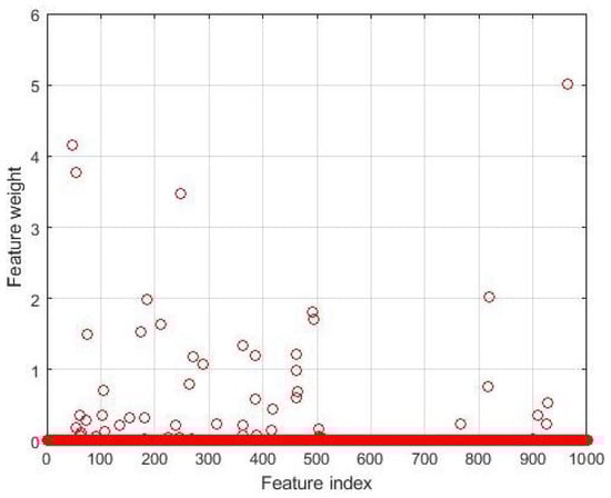 Step 5:  is used to train NCA model on the whole training set, and the weight of each feature is calculated. Finally, the feature whose weight value is greater than 0.05 of the maximum weight value is selected as the final classification feature, and the selected data set is represented as , and the feature weight value is represented as  [].