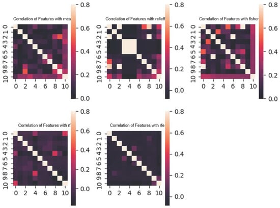 In order to verify the relationship between the selected features and categories, we use covariance to judge the correlation between features and display them in the form of thermal maps. As shown in Figure 12, the top ten features with the highest importance obtained by five feature selection methods and the correlation between tags are included. Number 10 represents class tags. In the heat map, the darker the color, the lower the correlation. RNCA, ReliefF, and Fisher have stronger correlation with categories than random forest and recursive elimination. Among them, there are more dark regions between various features of RNCA, indicating that the correlation between features is not strong and redundant features are less.
