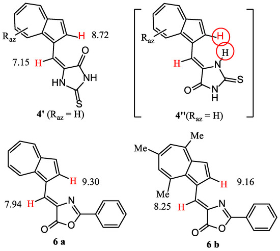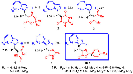 Azulen-1-yl-methylene substituted heterocycles (1, 2, 4–6) and 3-(azulen-1-yl-methylene)pentane-2,4-dione (3); δ (ppm) for protons in 1H-NMR spectra.