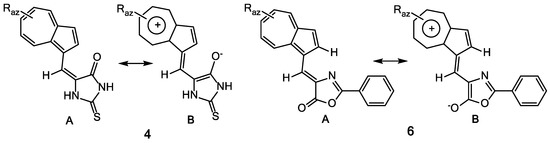 The UV-Vis and NMR spectra of compounds 6a–f (Table 2) are influenced by the nature and position of the grafted substituents on the azulene and phenyl moieties. Figure 2 suggests the stabilization of an entire system of these compounds by generation of tropylium structure (structure 6B) at azulene moiety, simultaneous with the aromatization of 5-membered heterocycle. Nevertheless, the UV-Vis spectra of compounds 6a–c do not differ significantly from those of the similar compounds 4 and 5, possibly due to the low participation of this aromatic structure at the molecules’ properties. Obviously, by the azulene substitution with alkyl groups, the stabilization of polarized system produces a bathochromic shift in visible in order 6c > 6b > 6a (with λ: 510; 486; 468 nm). The presence of nitro group at phenyl results in a bathochromic effect caused by the involvement of this chromophore in the conjugation of electron system.