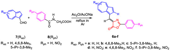 A mixture of hippuric acid (8H) (89.5 mg, 0.5 mmol) or 4-nitrohippuric acid (8NO2) (112 mg, 0.5 mmol) and azulen-1-carbaldehydes (7Raz) (0.5 mmol) in 2 mL of acetic anhydride, in the presence of sodium acetate (50 mg, 0.6 mmol) was heated under reflux for 2–4 h in inert atmosphere. When the reaction was complete (determined by TLC), the mixture was cooled to room temperature. Water and a small amount of methanol were added, and the resulting solution was extracted with DCM. The organic layer was washed twice with water to remove acetic anhydride and sodium acetate and was dried on anhydrous Na2SO4, and the solvent was evaporated in vacuum. The crude products were chromatographed on the silica gel column, using as eluent a mixture of petroleum ether and DCM in 1:1 volumetric ratio, with increased gradient in DCM (50–100% DCM). The products (6a–c) eluted as red-brown bands and the products (6d–f) eluted as violet bands. The samples for products’ characterization were realized by the second chromatographic separation in the same conditions, with the specification that in the case of compound 6d, acetone was used as eluent instead of DCM, for a better elution from the column. The reaction yield for all products was reported in Table 1.