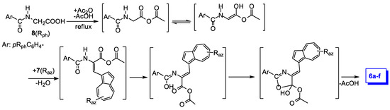 The proposed reaction mechanism [14] applied to the reaction in Scheme 1 is detailed in Scheme 2. The reaction of hippuric acid with acetic anhydride results in a new anhydride, which in turn reacts as enol tautomer with azulene-1-carbaldehyde. In the intermediate, thus formed, a new double bond displacement and subsequent ring closing, with acid removal, generates the desired products, 6a–f.