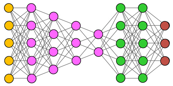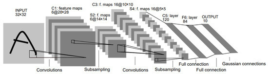 Figure 5 shows the classical LeNet5 neural network [22,23,24], whose structure consists of an INPUT layer, a convolutional layer (C1), a pooling layer (S2), a convolutional layer (C3), a pooling layer (S4), a convolutional layer (C5), a full-connection layer (F6), and an output layer. In LeNet networks, the nonlinear activation function is performed only once and is not always followed by a nonlinear activation function after each pooling. This process can be seen in the following chart: