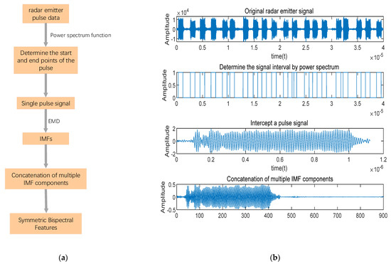 As shown in Figure 6, the starting point and ending point of the radar signal are first determined by the power spectrum. When a signal is sent, the power spectrum will have an obvious peak value. Then, each pulse of the radar signal is intercepted as a sample. Due to the short pulse duration, the interception of each pulse involves only 450 time domain signal points. This factor means that the long time-domain signal transform feature extraction method is no longer applicable and will lead to the extraction of features that are not very stable (e.g., through the double spectrum feature extraction algorithm and the need for feature extraction using the Fourier transform method). Through the method of EMD decomposition, normalized signals are decomposed into several signals of different frequency bands to reflect the characteristics of different frequencies. For example, the high-frequency component with high energy can represent the main characteristics of the original signal, and the low-frequency component can represent the distortion characteristics of the transmitter’s modulator.