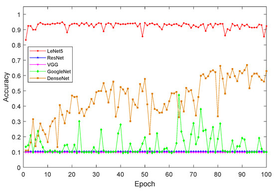 It can be seen from Figure 8 that LeNet has the best ability to identify the features of the 10 radar emitters, with an average accuracy rate of more than 90%. The Densnet neural network and Googlenet neural network have the ability to distinguish 10 radar emitter sources, but their network training processes are long, and their convergence performance is not as good as that of LeNet. The VGG neural network and Resnet neural network cannot classify the 10 radar emitters. Therefore, the LeNet neural network is more suitable for individual radar emitter identification tasks.