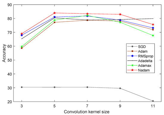 First, we change the sizes of the convolution kernels and transform the original two-dimensional convolution kernels into one dimension, in combination with different optimizers, to determine the optimal size of the convolution kernels; the experimental results are shown in Figure 9. We experimentally showed that, for a convolution kernel size of 1 × 5, the Nadam optimization algorithm provides the highest classification accuracy for 10 radar signals. Therefore, the convolution kernel size chosen for our improved one-dimensional LeNet network is 1 × 5, and the optimizer is the Nadam optimizer.