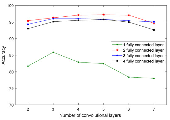 After the parameters of the network were determined, the network structure was adjusted to further optimize the performance of the network by changing the number of layers in the convolutional layer and the full connection layer. The experimental results are shown in Figure 10.