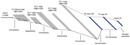 The LeNet neural network shown in Figure 5 above has a two-dimensional structure, and the input data are two-dimensional image data. To adapt to the recognition and classification of signals in this paper, we transform this network into a one-dimensional LeNet neural network. Specific improvements are described in Section 3.3 below.