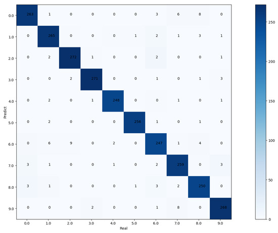 The confusion matrix can help us quickly visualize the recognition of 10 radar radiation sources. The confusion matrix is shown in Figure 13 below.