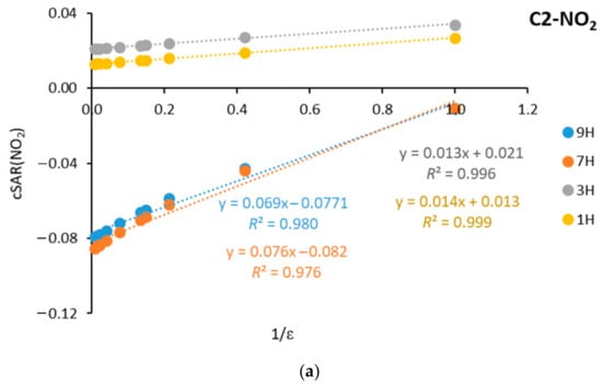 Relationships of cSAR(NO2) on 1/ε for C2- (a), C6- (b), and C8-NO2 (c)-substituted 9H, 7H, 3H, and 1H purine tautomers.
