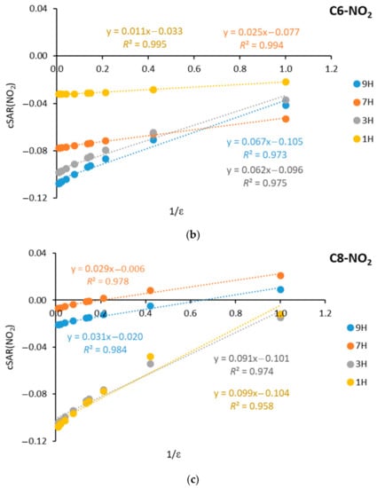 As mentioned above, the polarity of the solvent can significantly affect the strength of the reverse substituent effect. In the case of the studied nitropurine systems, variability of the EA properties of the nitro group to the solvent effect depends on a considered range of dielectric permittivity, ε. This is shown by the ranges of cSAR(NO2) variability (Table S1); in less polar solvents (ε < 10), they are even 6–25 times greater than in more polar solvents (ε > 10). However, plotting cSAR(NO2) versus reciprocal of the dielectric constant, 1/ε, gives well-correlated linear relationships (R2 > 0.95). These relations are presented in Figure 1; the slopes and R2 values of the linear relations are collected in Table S5. The slopes inform about the sensitivity of the EA properties of the nitro group to the polarity of the solvent, but as ε of the solvents considered are constant, these slopes are dependent only on the ranges of cSAR(NO2) variability. Therefore, slopes provide similar information to the ranges already discussed above. Thus, the EA properties of the nitro group in C8-substituted 3H and 1H tautomers are the most sensitive to the solvent effect, while the lack of the resonance effect and N···O interactions (systems with the perpendicular nitro group) lowers its sensitivity by about 25% (slopes in Table S5).