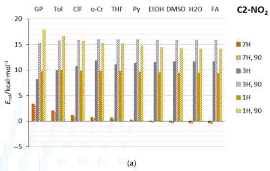 Solvent effects are important for tautomeric equilibria. They can affect the stability of individual tautomers to a different extent, eventually changing tautomeric preferences. Understanding the relative stabilities between tautomeric forms of heterocyclic compounds is a significant problem in bioorganic chemistry. Figure 2 shows the relative energies (Erel), with respect to the 9H tautomer, obtained in all considered environments for systems with coplanar and perpendicular nitro groups; their values are summarized in Tables S10 and S11, and also in Table 8 for the gas phase and formamide.