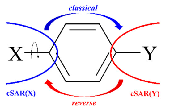 The substituent effect (SE) is one of the most important effects affecting the chemical, physical, and biochemical properties of chemical compounds. The classical substituent effect is most often described using the Hammett approach [15], which describes the dependence of various properties of the “reaction site” Y (the fixed group in a given series) on the properties of substituents (X) in disubstituted X-R-Y system. Classically, SE is described by the substituent constants, which are primarily derived from dissociation constants of substituted benzoic acids and characterize the electron-withdrawing/donating properties of substituents. Another way of understanding the SE concept is the description of mutual dependences between various properties of the reaction site Y, caused by changes of substituents X. A further aspect of SE is the influence of substituents X (or both X and Y) on the properties of the transmitting moiety, R. One more important aspect of understanding the SE is the reverse SE (Scheme 1) [16].