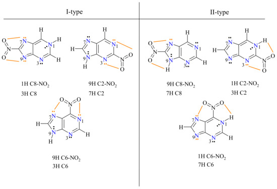 Possible proximities (I and II-type) of the NO2 group in C2-, C6-, or C8-NO2-substituted 9H, 7H, 3H, and 1H purine tautomers.