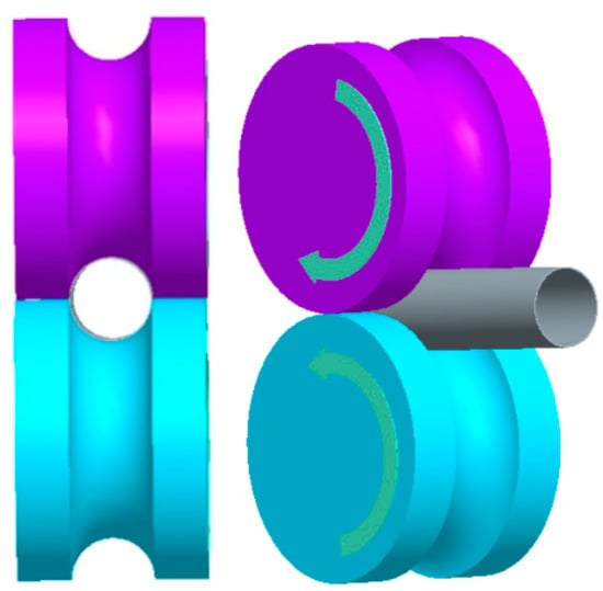The TRCC machine is mainly composed of two working parts, an upper roller and lower roller, as shown in Figure 1. The two rollers are closed to form a circular cavity and are symmetrical. The two rollers rotate in opposite directions, and the pipe is fed in via the action of friction. The pipe is reduced in diameter and the purpose of the calibration is completed. By designing the size of the circular cavity, the calibration with different reduction rates can be realized. In the process, continuous local loading not only reduces the tonnage, but also improves the efficiency of the calibration process.