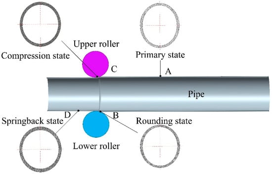 The TRCC process can be divided into three stages: rounding, compression, and springback, as shown in Figure 2. Only elastic deformation occurs when the pipe is in position B. From position B to position C, the deformation of the pipe changes from elastic to plastic, and the plastic deformation region expands along the thickness and circumferential directions as the pipe is fed. When the pipe is in position D, it is unloaded and rebounded to complete the continuous calibration of the whole pipe.