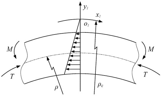 The equivalent strain is shown in Figure 4 when the pipe microbeam loading is under the combined action of tangential force T and bending moment M. As shown in Figure 4, the curvature radius of the equivalent strain neutral layer is changed to ρε and the curvature radius of the geometric center layer of the microbeam is changed to ρ. The coordinate system x1o1y1 is established, and the x axis coincides with the neutral layer of equivalent strain.