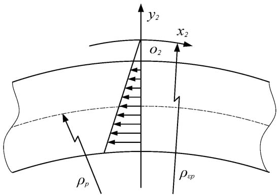 The strain after unloading εp is still a linear distribution in the cross-section of pipe, as shown in Figure 5. The curvature radius of the residual equivalent strain neutral layer is ρεp, and the curvature radius of the geometric center layer is ρp. The coordinate system x2o2y2 is established, and the x2 axis coincides with the neutral layer of equivalent strain after unloading.