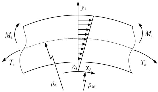 According to the unloading law, the springback strain εe is produced by the tangential force Te and bending moment Me which are equal, opposite, and at the same action points of the tangential force T and bending moment M, as shown in Figure 6. The curvature radius of the elastic equivalent strain neutral layer is ρεe, and the curvature radius of the geometric center layer is ρe. The coordinate system x3o3y3 is established, and the x3 axis coincides with the neutral layer of elastic equivalent strain.