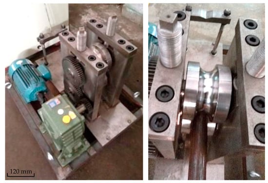 A scaled-down TRCC device (Yanshan University, Qinhuangdao, China) was developed to be used to verify the feasibility of the process, as shown in Figure 9. The device is mainly composed of upper lower rollers, frame, a transmission system, and a power system. In the calibration process, the profile of the upper and lower roller forms a circle. There is a 2 mm gap between the two rollers. The pipe selected for the experiment is the same as that for the simulation. In order to reduce the experimental cost compared to the submarine pipe, the size of the experimental pipe was scaled equally. In the calibration process for pipes, the scale effect can be ignored [,,,,].