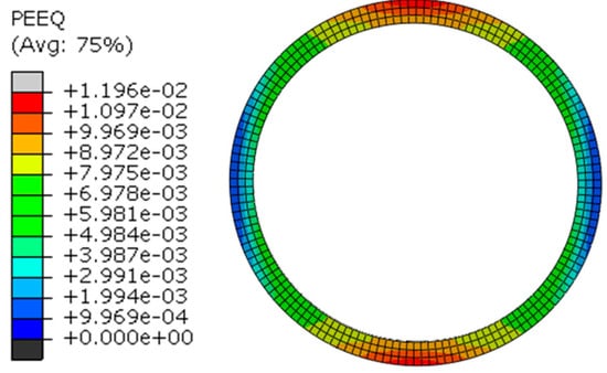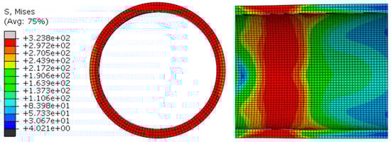 The distribution of equivalent stress is shown in Figure 10. It can be seen that the equivalent stress distribution on the section is uniform in the local loading position. The value is greater than yield stress, which indicates that all areas of the pipe undergo plastic deformation during the calibration process.