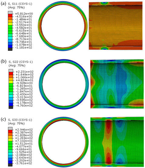 Distribution of the three principal stresses after the TRCC process: (a) radial stress, (b) tangential stress, and (c) axial stress.