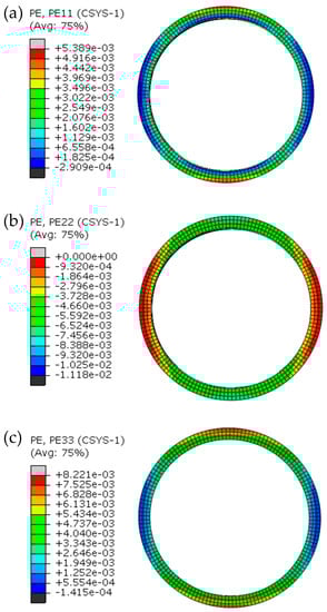 Distribution of three principal strains after TRCC process: (a) radial strain, (b) tangential strain, and (c) axial strain.