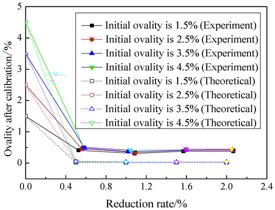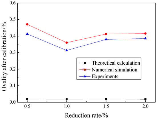As shown in Figure 14, the ovality after calibration decreases with the increase in the reduction rate, and finally tends to be saturated. Figure 15 shows that the ovality after calibration decreases first and then increases with the increase in the reduction rate, and finally tends to be saturated, which indicates that the calibration effect is optimal when the reduction rate is about 1% from the results of theoretical calculation and numerical simulation. The ovality obtained by theoretical calculation is much better than that by numerical calculation and experiments.