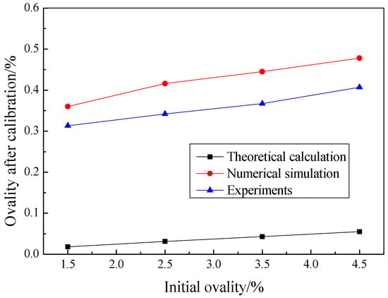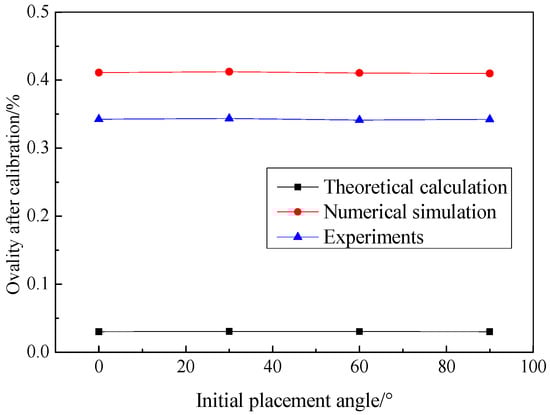 When the reduction rate was 1%, theoretical calculation, numerical simulation, and experiments were carried out to study the influence of initial ovality and initial placement angle on the ovality after calibration, and the results are shown in Figure 16 and Figure 17.
