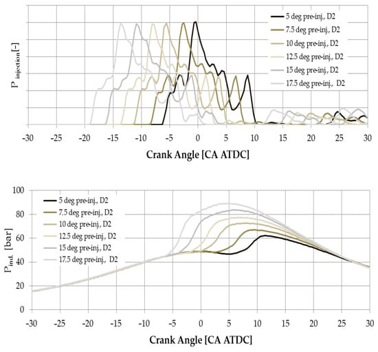 The combustion chamber pressures and injection tube pressures for D2 fuel and 20 kW load are shown in Figure 2. For both figures, the averages of 75 cycles at one operating point are shown. In the case of injection tube pressure, the pressure drop observed is associated with the first pressure drop at the start of injection and the pressure oscillations after injection are observed. The high ignition delay characteristic of this engine is clearly observed for the in-cylinder pressure. For pre-injections at 17.5, 15, and 12.5 degrees, the maximum pressure location is observed around 5 degrees (ATDC) for smaller pre-injections, the maximum location shifts significantly after TDC.