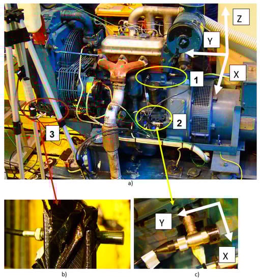 Points of measurement of vibrations and sound pressure: (a) general view of the engine being analyzed and points of measurement of vibrations (points 1 and 2) and sound pressure (point 3); (b) a microphone to measure sound pressure (point 3); (c) accelerometers to measure vibrations (point 2) in X and Y directions.