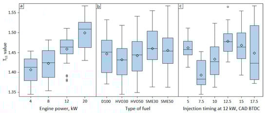 Distribution of time domain parameter calculated from TRAV1 by (a) Engine power, (b) Type of fuel, and (c) Injection timing.