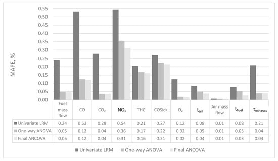 Mean absolute percentage error for exhausted emission parameters calculated from univariate linear regression model (LRM), one-way ANOVA and final ANVOVA.