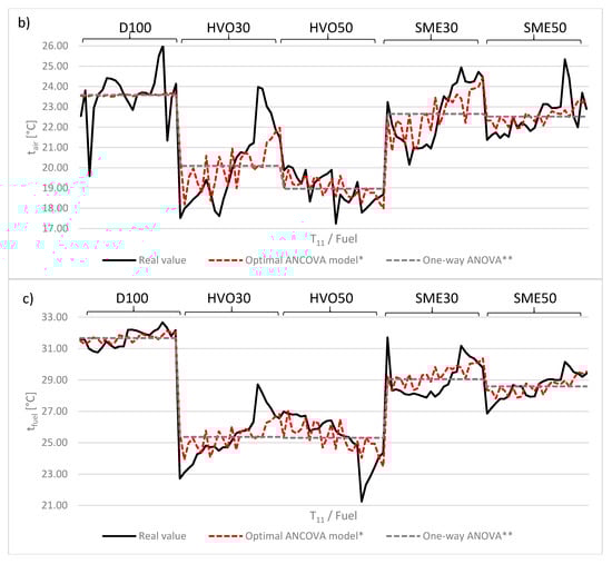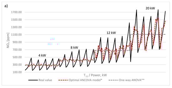 Step 2 ANCOVA model with two factors ( at TRAV1 and engine power or type of fuel) remained the best predictive model for all 11 exhausted emission parameters with the lowest MAPE values for all exhausted emission parameters (Figure 5). The most MAPE reduction was defined in NOx, tair, and tfuel comparing ANOVA and ANCOVA models. Figure 6a shows that increased prediction accuracy was observed in higher engine power regardless type of fuel, whereas vibration covariate has not had any influence in low (4 kW and 8 kW) engine power. Furthermore, vibration covariate has also not had any influence in pure diesel engines. However, at TRAV1 influence greatly improved while diesel mixtures were used (Figure 6b,c).