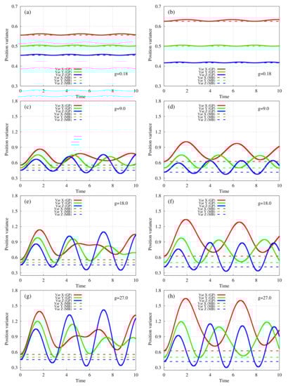 Many-particle position (, , and ; in red, green, and blue) variance per particle as a function of time computed at the limit of an infinite number of particles within many-body (dashed lines) and mean-field (solid lines) levels of theory in an interaction-quench scenario. The harmonic trap is 10% anisotropic in panels (a,c,e,g) and 20% anisotropic in panels (b,d,f,h). The coupling constant g is indicated in each panel. Different anisotropy classes of the position variance emerge with time. See the text for more details. The quantities shown are dimensionless.