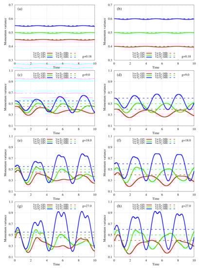 Many-particle momentum (, , and ; in red, green, and blue) variance per particle as a function of time computed at the infinite-particle-number limit within many-body (dashed lines) and mean-field (solid lines) levels of theory in an interaction-quench scenario. The harmonic trap is 10% anisotropic in panels (a,c,e,g) and 20% anisotropic in panels (b,d,f,h). The coupling constant g is indicated in each panel. Different anisotropy classes of the momentum variance emerge with time. See the text for more details. The quantities shown are dimensionless.
