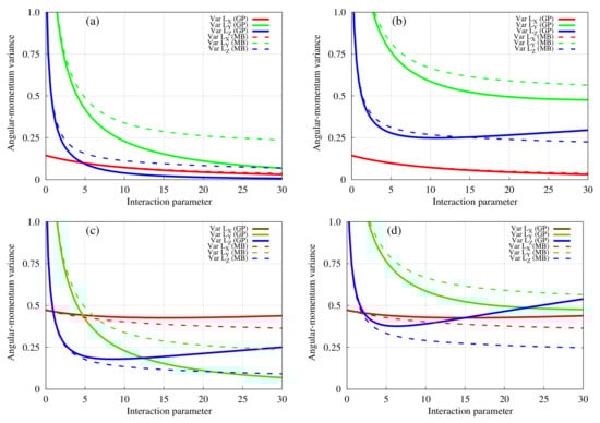 The meaning of result (A2) is that the correlations terms of the translated angular-momentum variances depend on the respective correlations terms of the momentum variances and components of the translation vector . Consequently, the translated angular-momentum correlations terms (A2) generally depend more strongly on the interaction parameter than the untranslated ones. Indeed, Figure 3 plots some examples of angular-momentum variances for different , and shows that, once translations of the trap are included, the angular-momentum variances of a trapped Bose–Einstein condensate at the limit of an infinite number of particles can belong to any of the anisotropy classes, , , or .