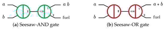 Logic gates were implemented using SDR by three main methods: The first implementation was the seesaw gate by Lulu Qian and Erik Winfree in 2011 [,]. This gate has three operations: seesawing (reversible), thresholding (irreversible), and reporting (irreversible) operations where the reversible operation is the operation that can produce the inputs through the outputs and vice versa, while the irreversible operation produces only the outputs through the inputs. Seesaw gate acts as AND and OR gates directly as shown in Figure 1 by changing the thresholding concentration only. Seesaw-AND and seesaw-OR gates have become the basic units (elementary gates) to implement any Boolean function by converting the function to an equivalent circuit with only AND and OR gates, using dual-rail logic because it is not possible to perform a NOTgate in the SDR system [,]. The seesaw gate took hours to compute the outputs of the four-bit square root circuit by using about 130 strands in the operation [].