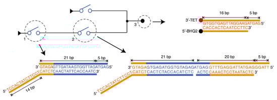 The third implementation was DNA-based switching circuits (DSC) by Fei Wang et al. [] in 2020. This experiment follows a different technique to implement logic circuits which is Shannon’s switching circuit []. A switch is synthesized in DNA as a partial double-stranded that represents the OFF (0) state as shown in Figure 2, and after the switch responds to the required signals, it turns to fully double-stranded which represents the ON (1) state, then it generates a signal for the next switch to turn it ON, and so on.