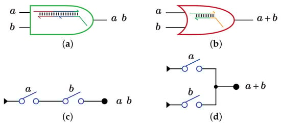 DNA-based AND, OR gates using Strand Displacement Reactions (SDR) and Switches (DSC) []. (a) SDR implementation for AND gate. (b) SDR implementation for OR gate. (c) DSC implementation for AND gate. (d) DSC implementation for OR gate.