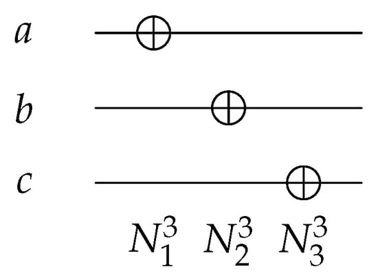 The N gate, such as , as shown in Figure 4, is a 1-bit gate with ; it inverts the input value from 0 to 1 and vice versa. The N gate can act on any wire of the 3 input/output circuits, giving different functions as shown in Equation (1).