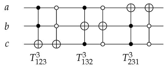 Depending on this approach many libraries were presented with 3-bit circuits as the reversible circuits over 3-bits form a permutation group of size 40,320 (), which is a subset of the symmetric group. The presented libraries are such as , , , , , , , , , , , , , as P is the Peres gate, F is the Fredkin gate, is the Generalized Toffoli gate [], and , , , are the proposed libraries in [,], any universal reversible libraries is considered as the generator of the permutation group [,].