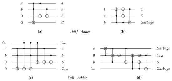 Reversible implementations for 1-bit Half Adder and 1-bit Full Adder circuits. (a) 1-bit Half Adder reversible circuit using and gates with quantum cost () = 7. (b) 1-bit Half Adder reversible circuit using gate with = 7 before cost optimization and = 4 after cost optimization []. (c) 1-bit Full Adder reversible circuit using and gates with = 18. (d) 1-bit Full Adder reversible circuit using gate with = 14 before cost optimization and = 8 after cost optimization [].