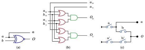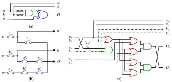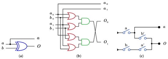 gate is constructed using by XOR gate as in Figure 10a with because it consists of two layers in the dual-rail logic mode as in Figure 10b. implementation using requires two layers with four switches as shown in Figure 10c with .