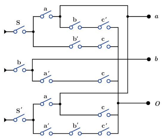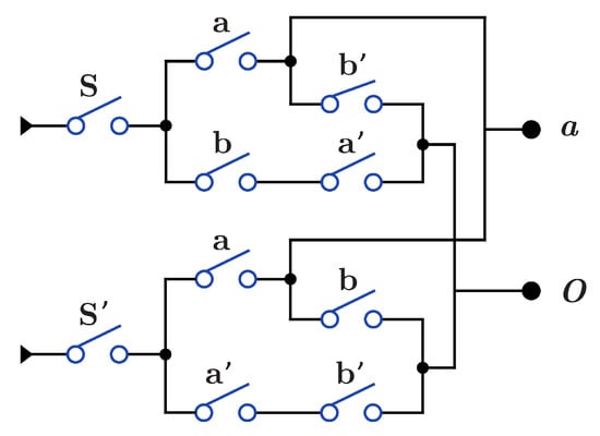 Figure 16 presents circuit for gate that acts as both and through the S switch with . When , the circuit acts as , while when (), the circuit acts as . Circuit paths in Figure 16 that start with input b are common paths for and gates. construction for has and is similar for open and closed states as in Figure 14a and Figure 15a, applying N for each open control bit.