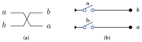 Swap gate is constructed using with by swapping the wires as in Figure 13a and implemented with using by one layer with two switches as in Figure 13b.