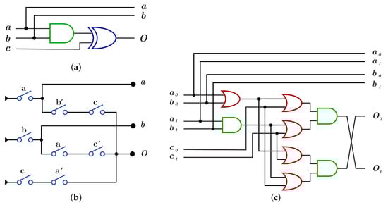 The construction of using is done by using AND gate for the control bits and XOR gate for the target bit as shown in Figure 14a with because of the dual-rail three layers with five OR gates and three AND gates as in Figure 14c, while the construction using requires three layers with eight switches and as shown in Figure 14b.