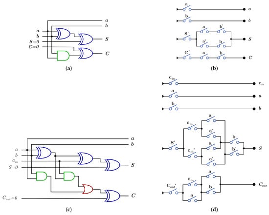 As an application for reversible gates, Figure 8 presents four reversible implementations for 1-bit Half adder and 1-bit Full adder circuits. The Half adder circuit implementations are shown in Figure 8a,b with for both implementations equal to 7, while the Full adder circuit implementations are shown in Figure 8c,d with equal to 18 and 14, respectively. Figure 8b,d for 1-bit Half adder and 1-bit Full adder, respectively, are implemented using gate [] with for Half Adder circuit after cost optimization in Figure 8b and for Full Adder circuit after cost optimization in Figure 8d [].
