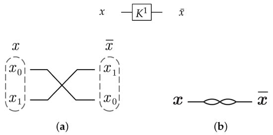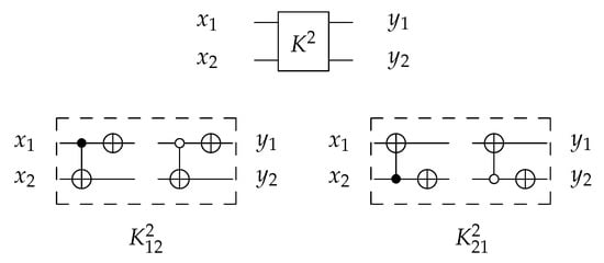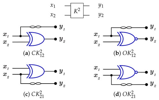 For 2-bit circuits, the library is universal for 24 possible circuits and has four generators and with open () and closed control (). The 2-bit gate is the merging of C and N gates into one gate () with for each generator. The library generators are shown in Figure 19 and the function of each generator is shown in Equation (5). To implement any generator in the reversed direction, the gates must be implemented in a reverse order by applying N gate first, then C gate.